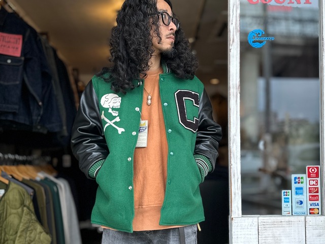 WHITESVILLE WV15787 30oz. WOOL MELTON HALF LENGTH AWARD JACKET "CHEVY LOVER" 裾リブが無くハーフ丈タイプのアワードジャケットは珍しい型の1つ。 今回のデコレーションタイプはハーフ丈タイプに合うモーター系の"シェビーラバー"を背中に落とし込み,前身頃に施されたサガラ刺繍のシニールと背中の横振り刺繍の組み合わせによりユニークな1着に。 サイズスペック S 肩幅/約47cm 身幅/約58cm 着丈/約68cm 袖丈/約61cm 素材 . (表地)ウール 100% .(裏地)レーヨン 50%,コットン 50% .(中綿)ポリエステル 100% . (皮革部分)牛革 .(リブ)アクリル 100% .(刺繡部分)レーヨン 100% .MadeInChina *平置きでの実寸値になります。 *170cm57kg S著用 *光の当たり加減等により実際の商品の色目と若干異なる場合がございますので予めご了承ください。 *商品在庫は実店舗と共有しており、御注文可能な状態になっている商品であっても、既に完売となっている場合はキャンセルとさせて頂きます。 ・WHITESVILLE(ホワイツビル) 「ホワイツビル」は、元々スポーツウエアやアンダーウエアを扱うメーカーで、1950年代にアメリカの 大手百貨店の通信販売などでも一部扱われていた。 作りだけに限らず、素材、パーツに至るまで余す事無く受け継ぎ、デザインは独自の発想を元に現代に蘇らせている。