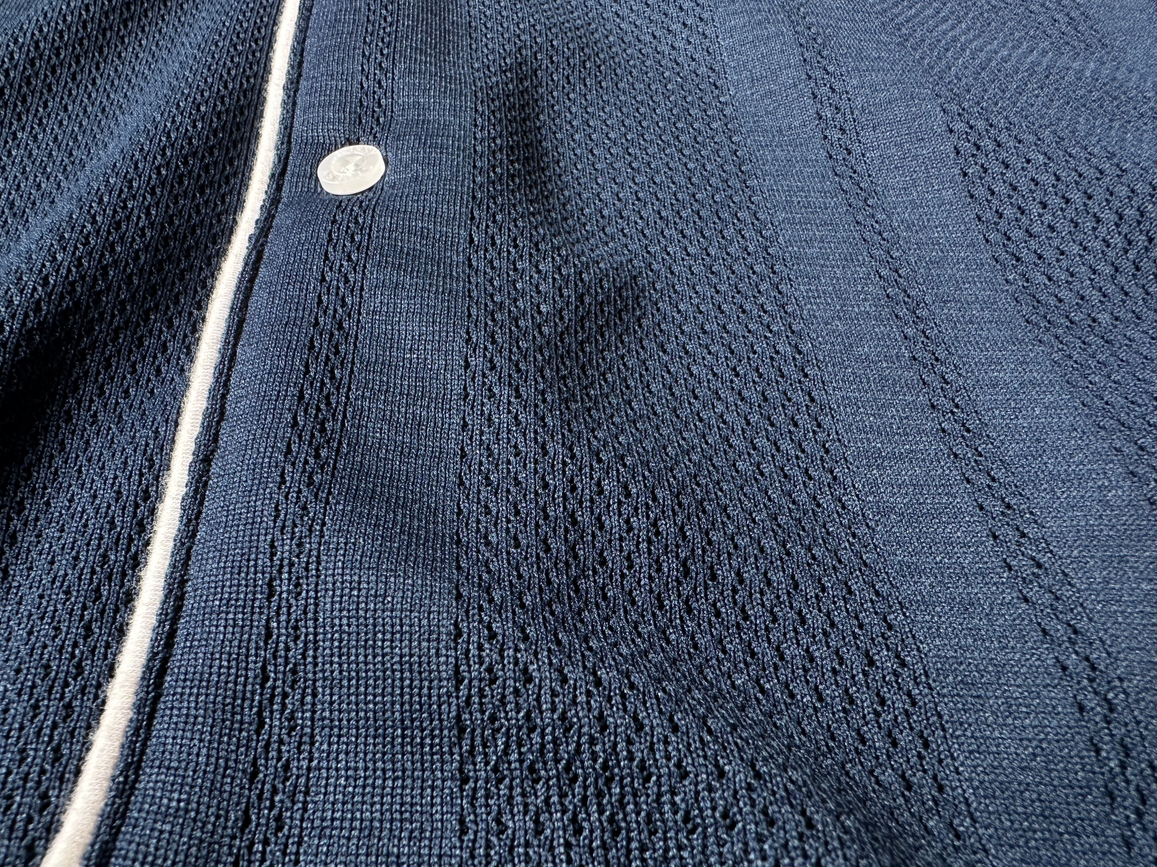 メッシュ状のテクスチャードポリエステルを使用した快適なBODY、そして、丸襟から前立て部分に施された可愛らしいパイピング。