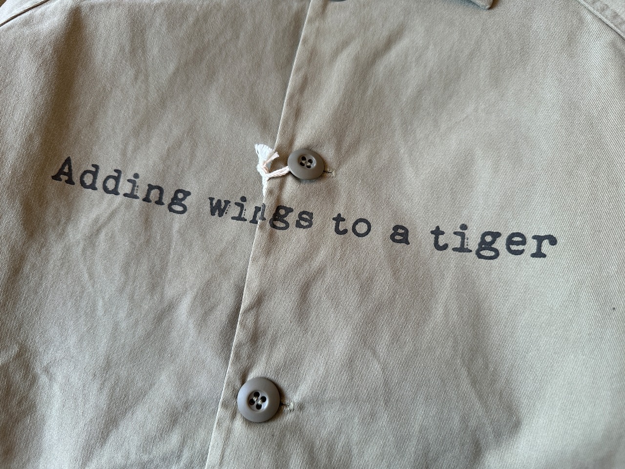 フロントには、虎に因んだスラング、Adding wings to a tiger(虎に翼を授ける)のプリント、バックには虎柄のプリントが入ります。