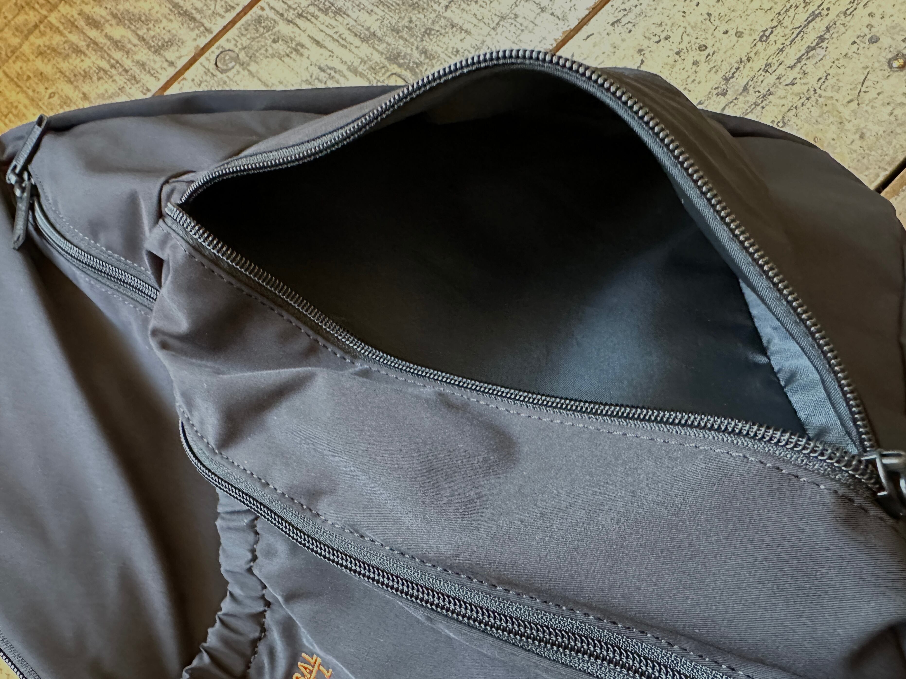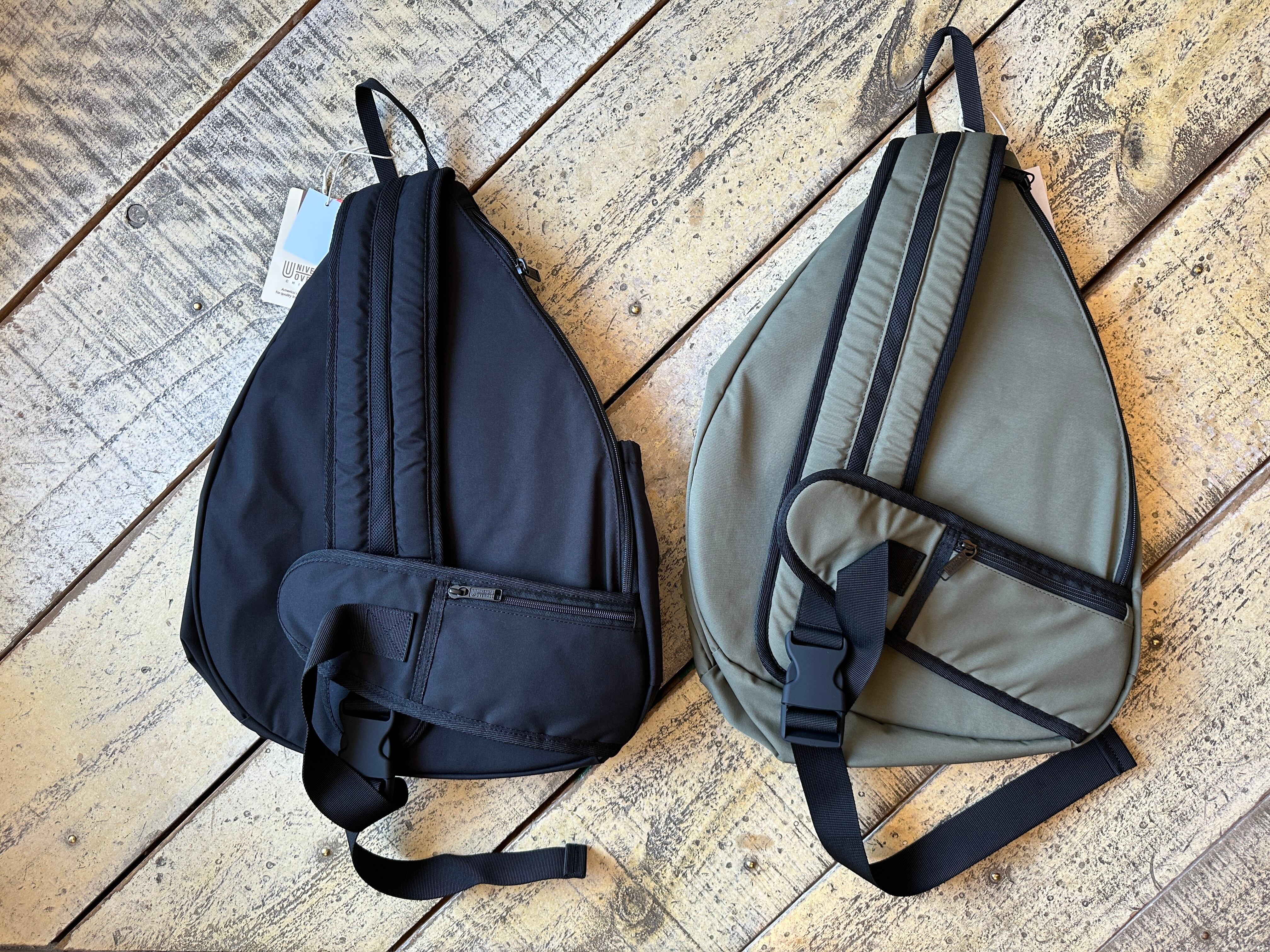 軽量かつソフトで肌触りの良いコットンライクな撥水ポリエステルを採用し底面を広く取りより三角形にボリュームを出したこだわりのシルエットと片掛けのショルダーは負荷を軽減させるために太くし真ん中をエアメッシュにすることで重さの軽減と体温を逃し蒸れにくい高機能の完全オリジナル仕様となります。