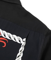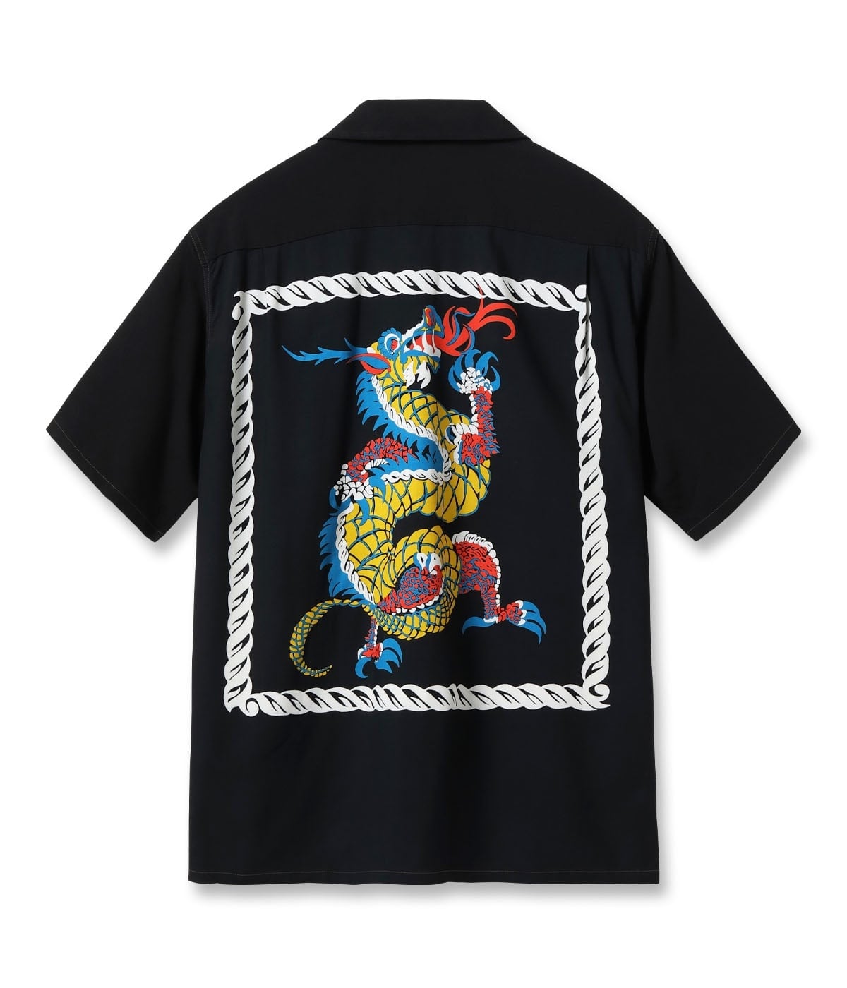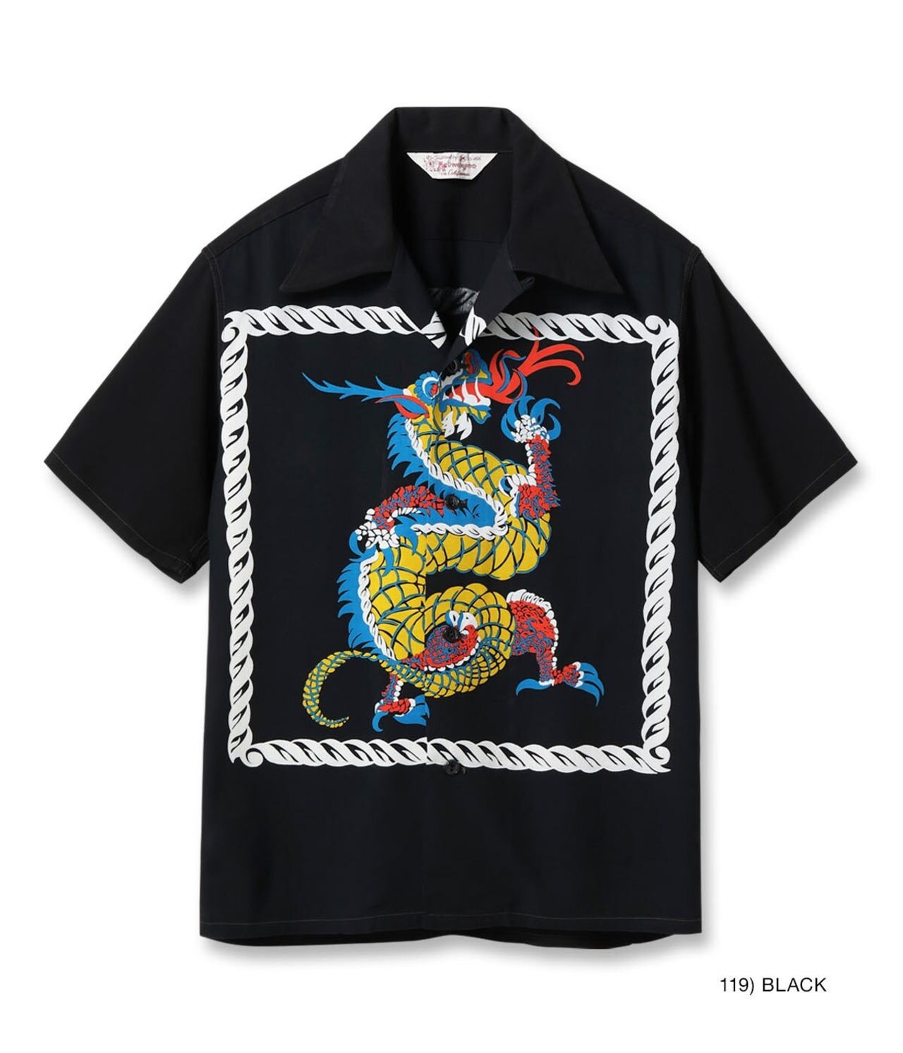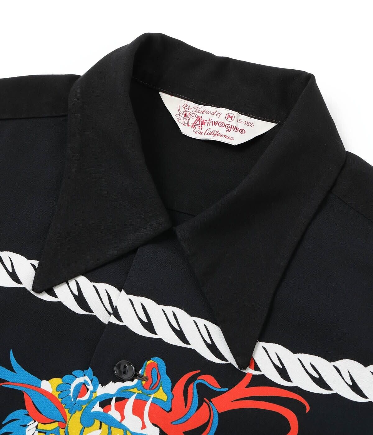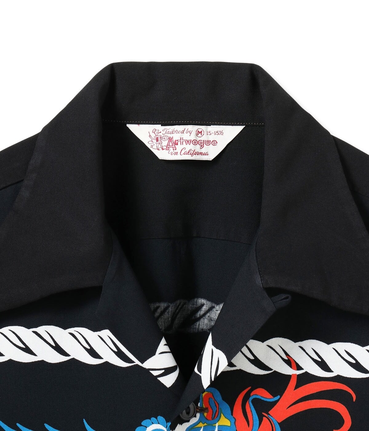厚手のレーヨン羽二重の生地を使い、ダイナミックにフロントとバックの両面に配されたドラゴンが非常に強いインパクトを放つ一枚。この作品を手掛けたアートヴォーグ・オブ・カリフォルニア社はバックパネル・パターンを得意としていたが、それに通ずるものがあり、アートヴォーグの持つ感性が色濃く反映されたデザインとなっている。中国の元の時代は五本の爪を持ち、頭に二本の角を生やした龍だけが本当の龍であるとされ、皇帝だけが使用できる特別なデザインとされていた。最高の位を意味する龍が海を渡り、アメリカ西海岸でアロハシャツのモチーフとして描かれた時代と文化を超えた大作。
