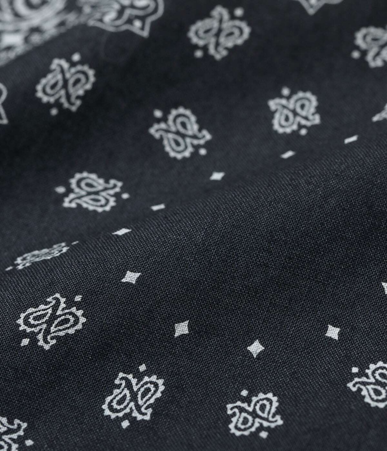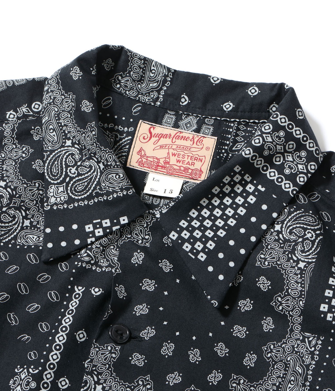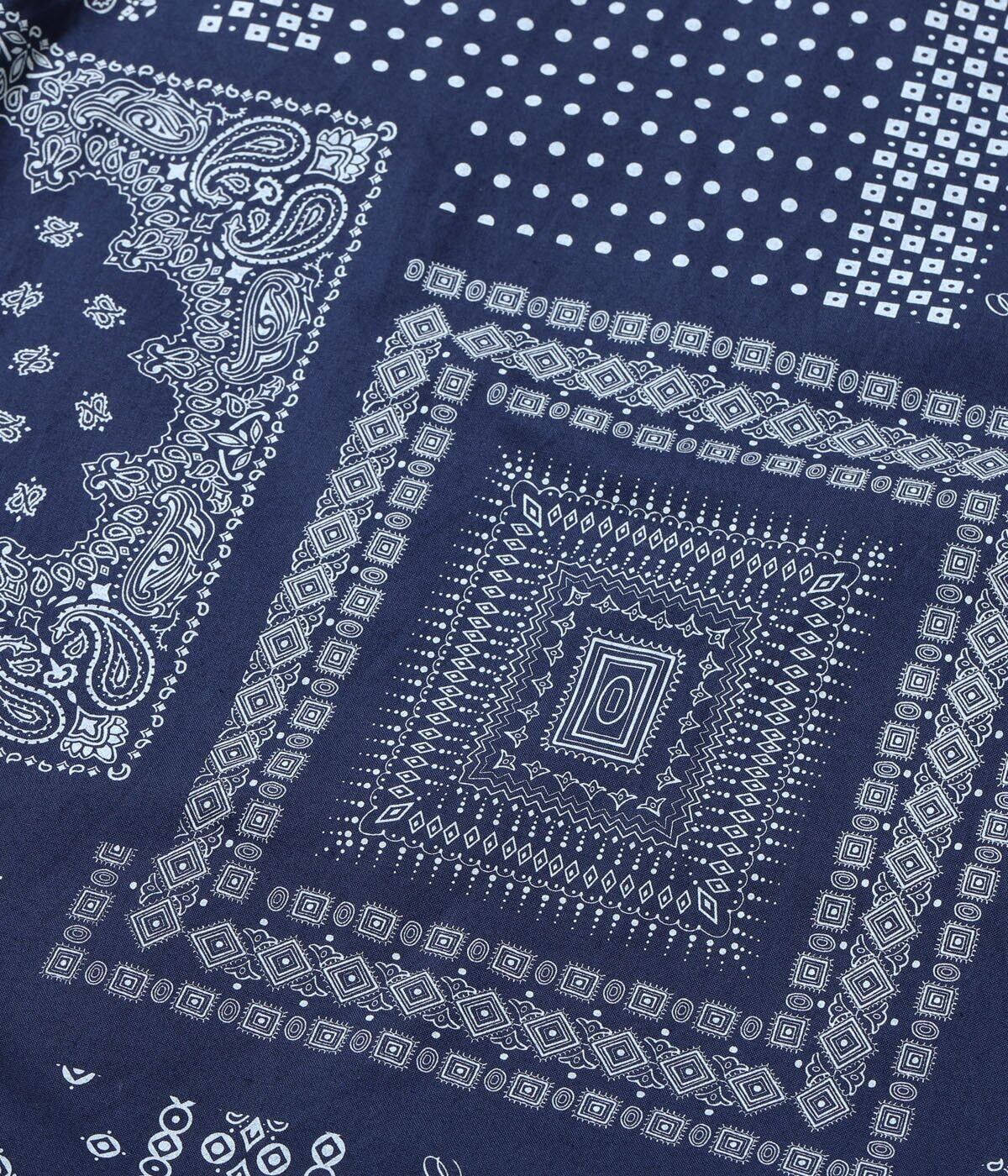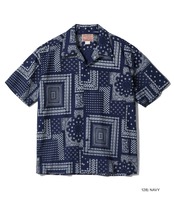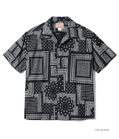ヴィンテージのバンダナに見られるドッド柄やペイズリー柄、幾何学柄などを散りばめてパッチワーク風に総柄でプリント。様々な柄が重なり合い、ユニークな柄に仕上がった。ややハリのある生地感のオープンシャツで、フロントに猫目ボタンを使用している。