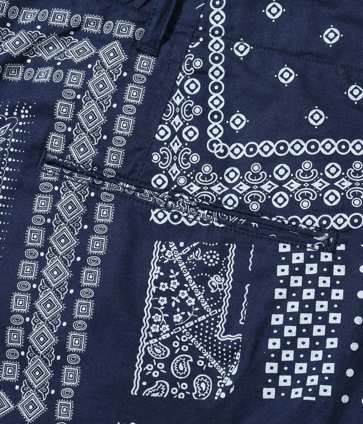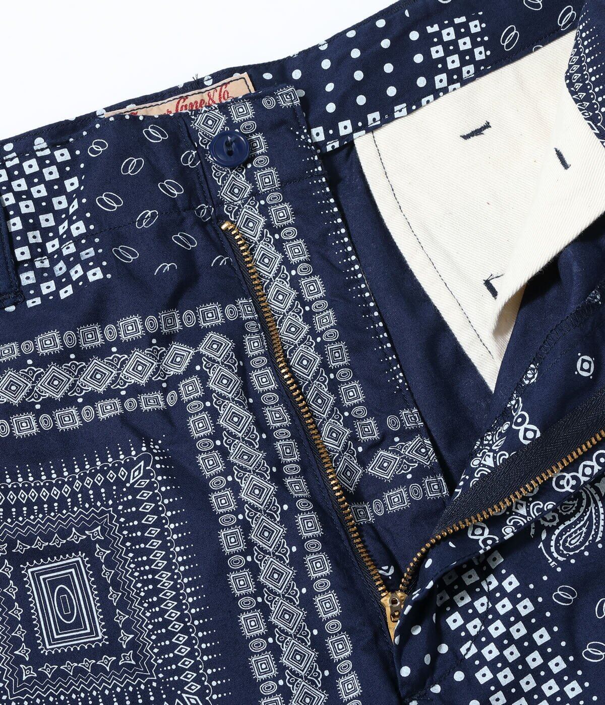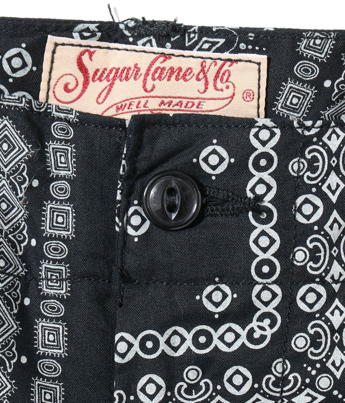 ヴィンテージのバンダナに見られるドッド柄やペイズリー柄、幾何学柄などを散りばめてパッチワーク風に総柄でプリント。様々な柄が重なり合い、ユニークな柄に仕上がった。同じ生地を使用したオープンシャツ「Lot No. SC39465」とセットアップで着用可能。