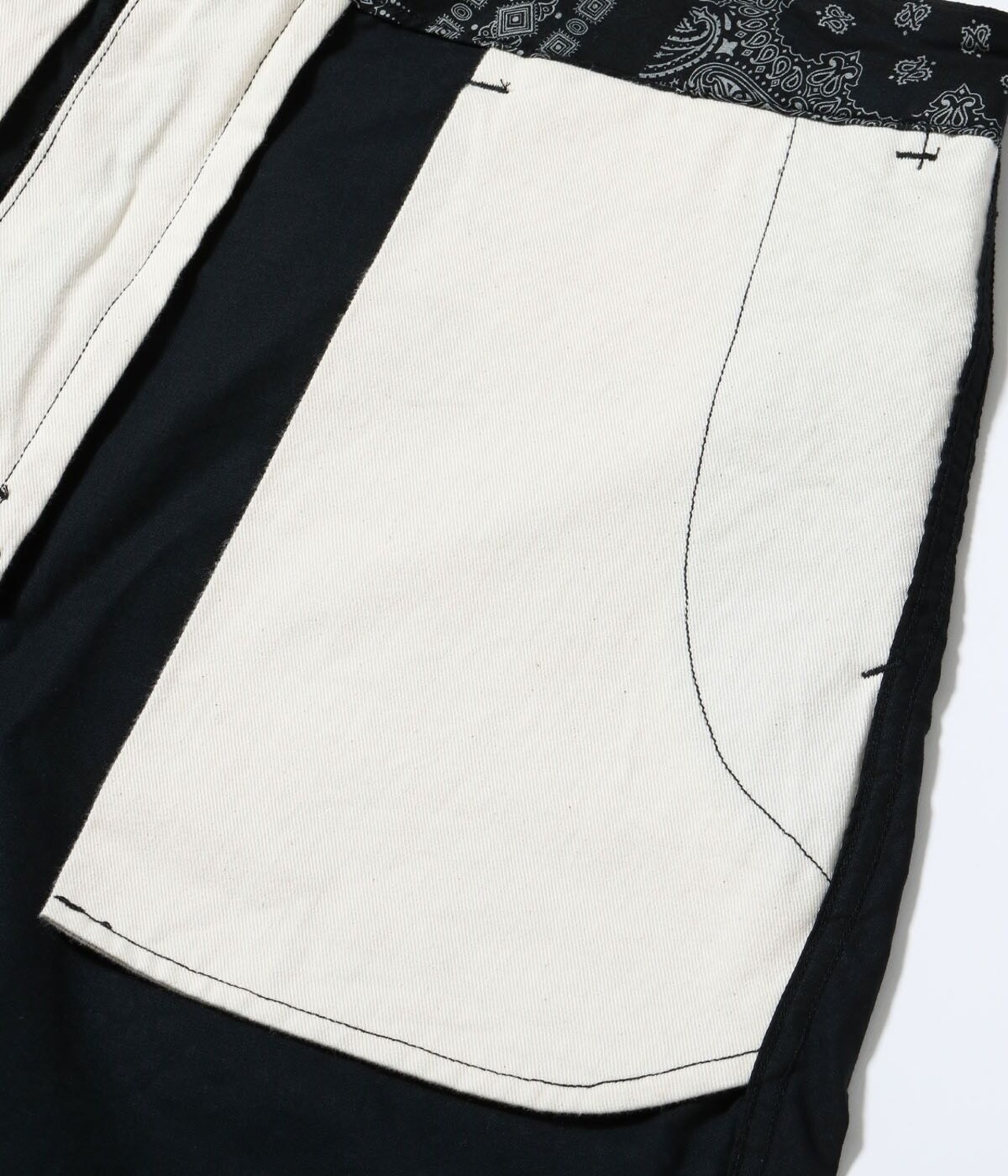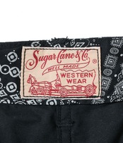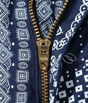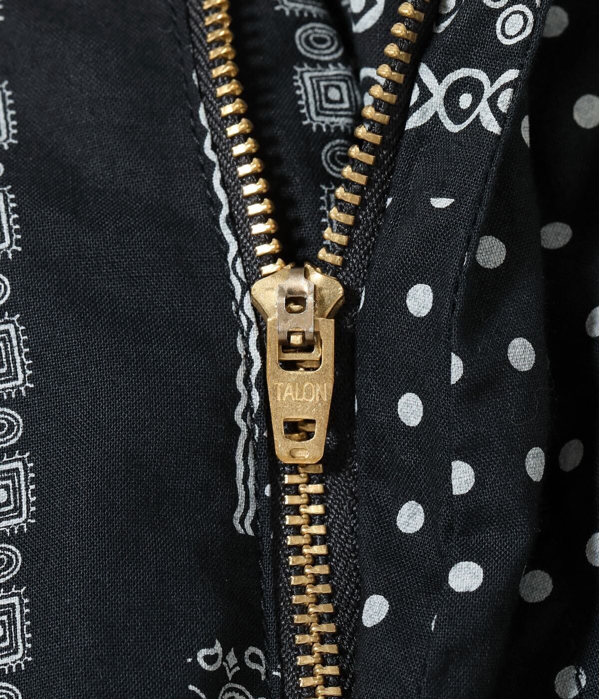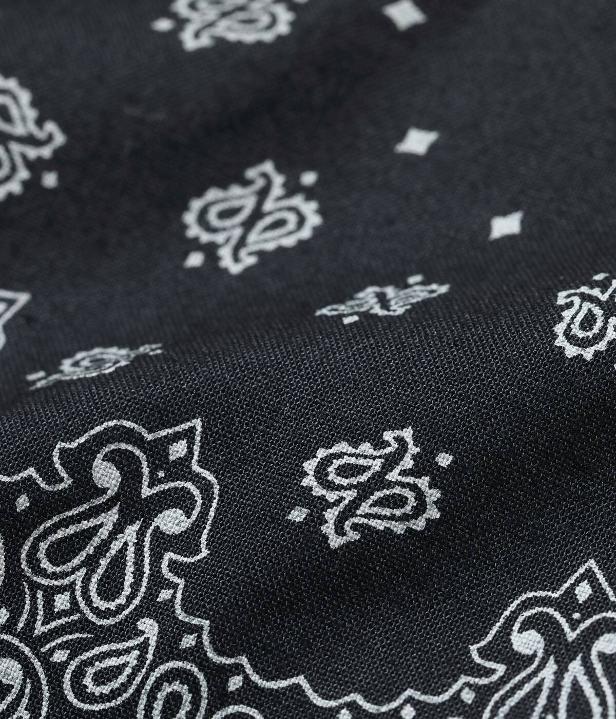 ヴィンテージのバンダナに見られるドッド柄やペイズリー柄、幾何学柄などを散りばめてパッチワーク風に総柄でプリント。様々な柄が重なり合い、ユニークな柄に仕上がった。同じ生地を使用したオープンシャツ「Lot No. SC39465」とセットアップで着用可能。