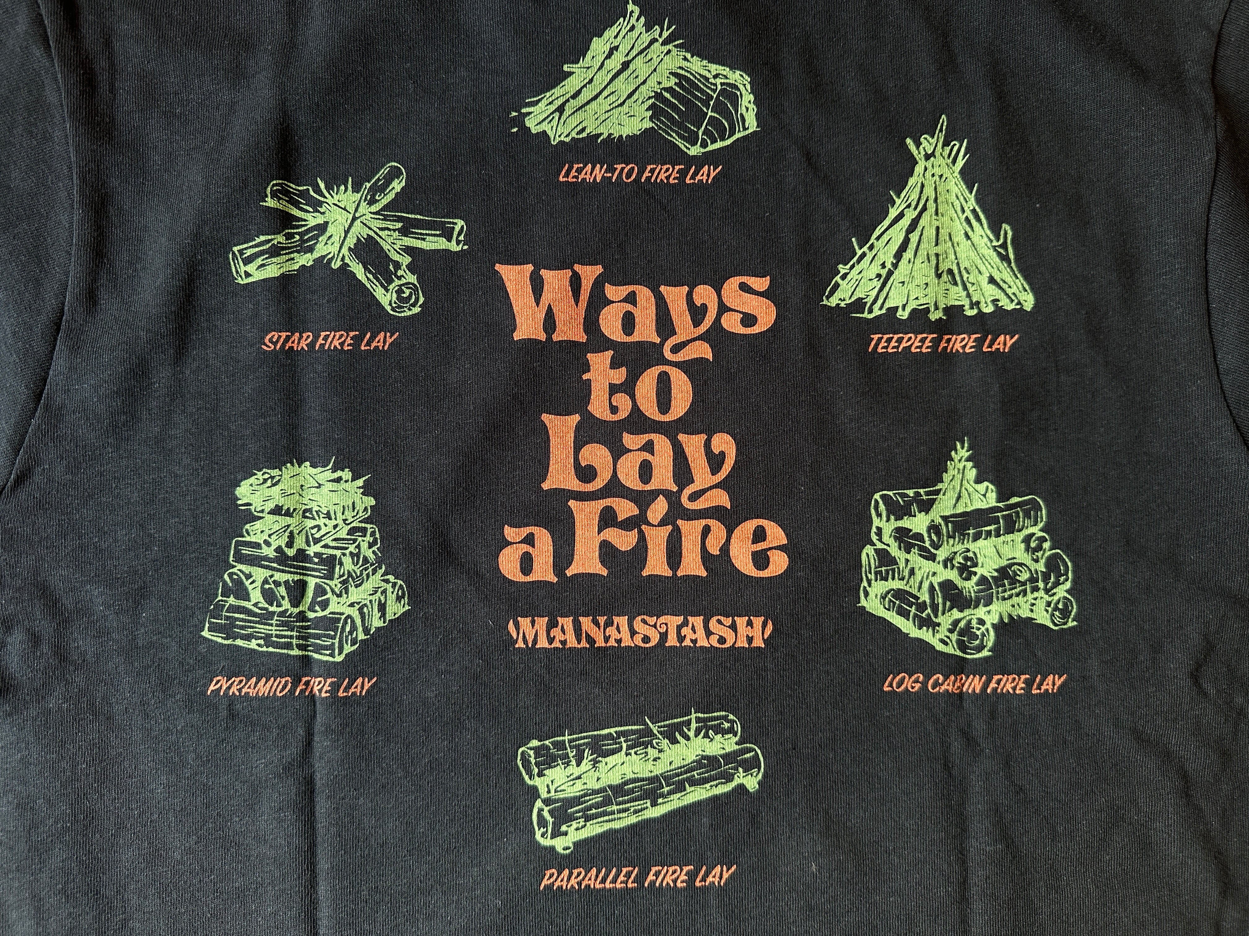・アウトドアシーンでは欠かせない、【FIRE LAY(焚火)の木の組み方】の種類が描かれた、MANASTASHらしいグラフィック。