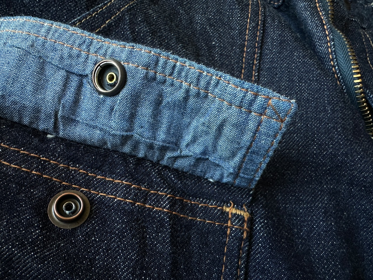※当製品は着心地を追求する為、旧式の織機によって作られたデニム地を使用しており、綿が本来持っている伸縮性、弾力性を実現しています。その為、布地の特性上、商品に約1~2センチ程度の個体差が生じる場合がございます。また、サイズ表記につきましても、実物を実際に採寸し、平均値を出したものを記載しております。