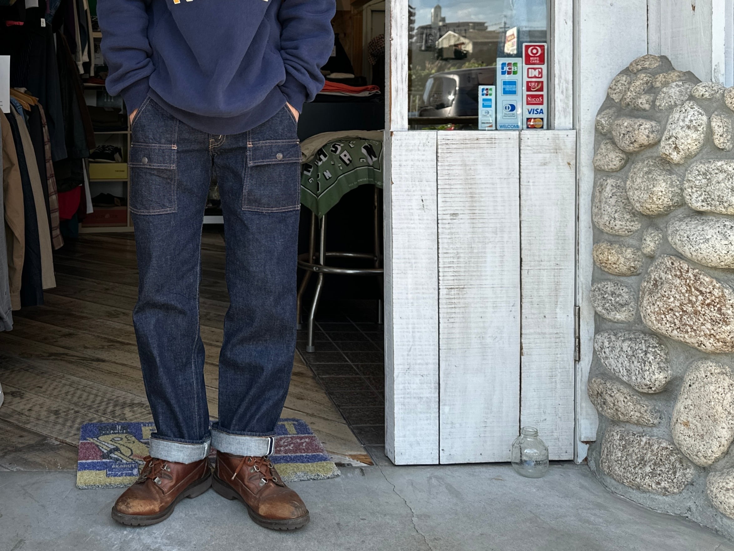 定番ジーンズと同様に、13.7oz のジンバブエコットン100%を使ったコチラの一本。1108モデルのシルエットをベースに採用しており、ブッシュとは『灌木、やぶ、茂み』の意。そうした場所で穿くようなボトムのイメージから名付けられたのがブッシュパンツとなります。過酷な環境にも適応する機能性、品質、デザインの良さをフルカウントのフィルターを通してミックスし、デイリーユースに落とし込みました。特長的なポケットの配置に、縫製糸からボタン一つにまでとことんこだわりを追求した一本。もちろん細身のシルエットならではの美しさは、アクセントが欲しい時の一本として活躍間違いなし。詰め込まれたディティールより色落ちするデニムはこの一本でしか表現できません。