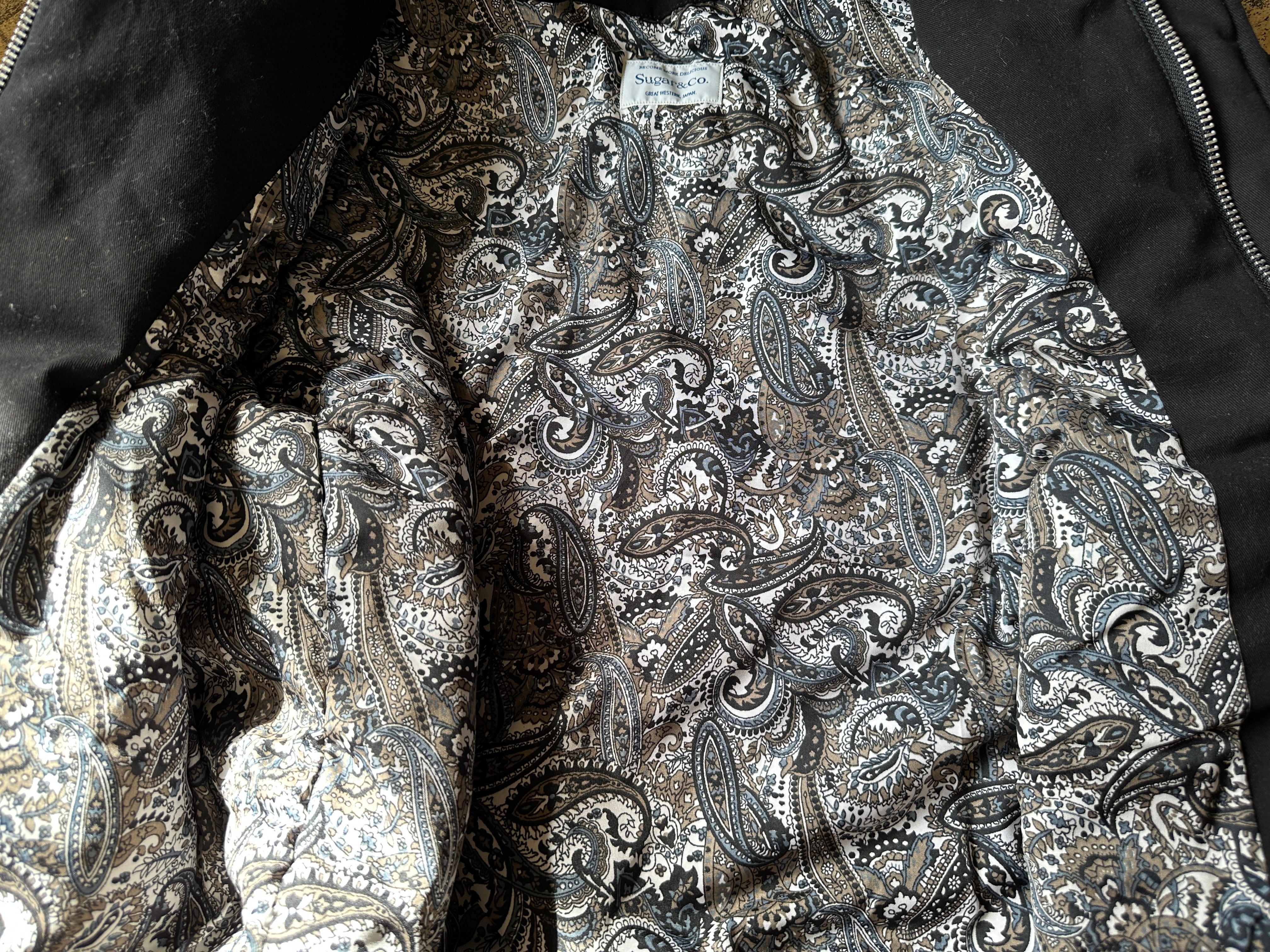 インナーには肌触り 抜群のビスコース素材に、このジャケット第二の顔とも呼べるペイズリー柄で。ファスナー付きの 2 重ポケット、迫力満点のフロントのビックジッパー等、その佇まいだけでバックボーンの奥深さを感じさせてくれる贅沢な1着です。