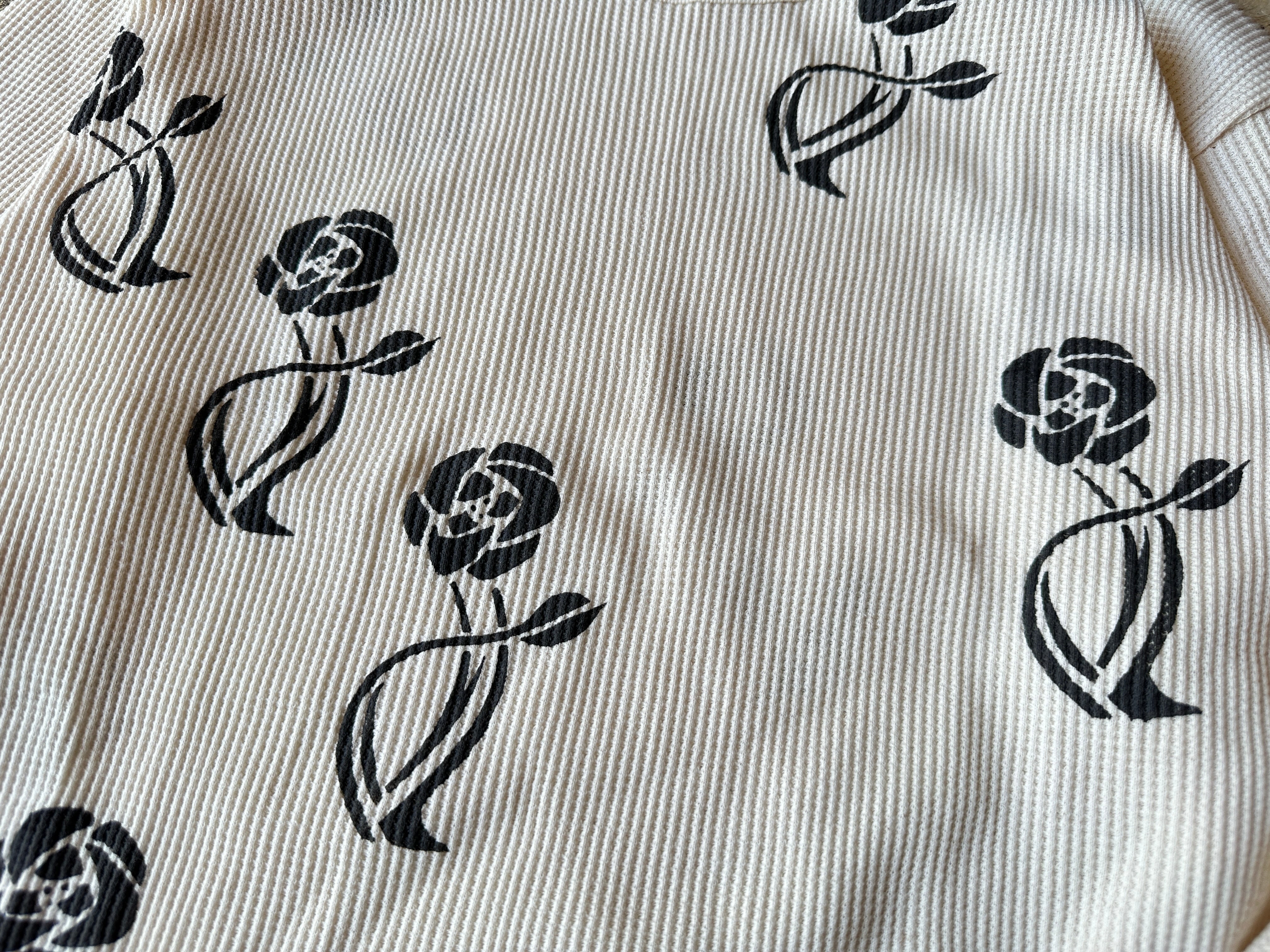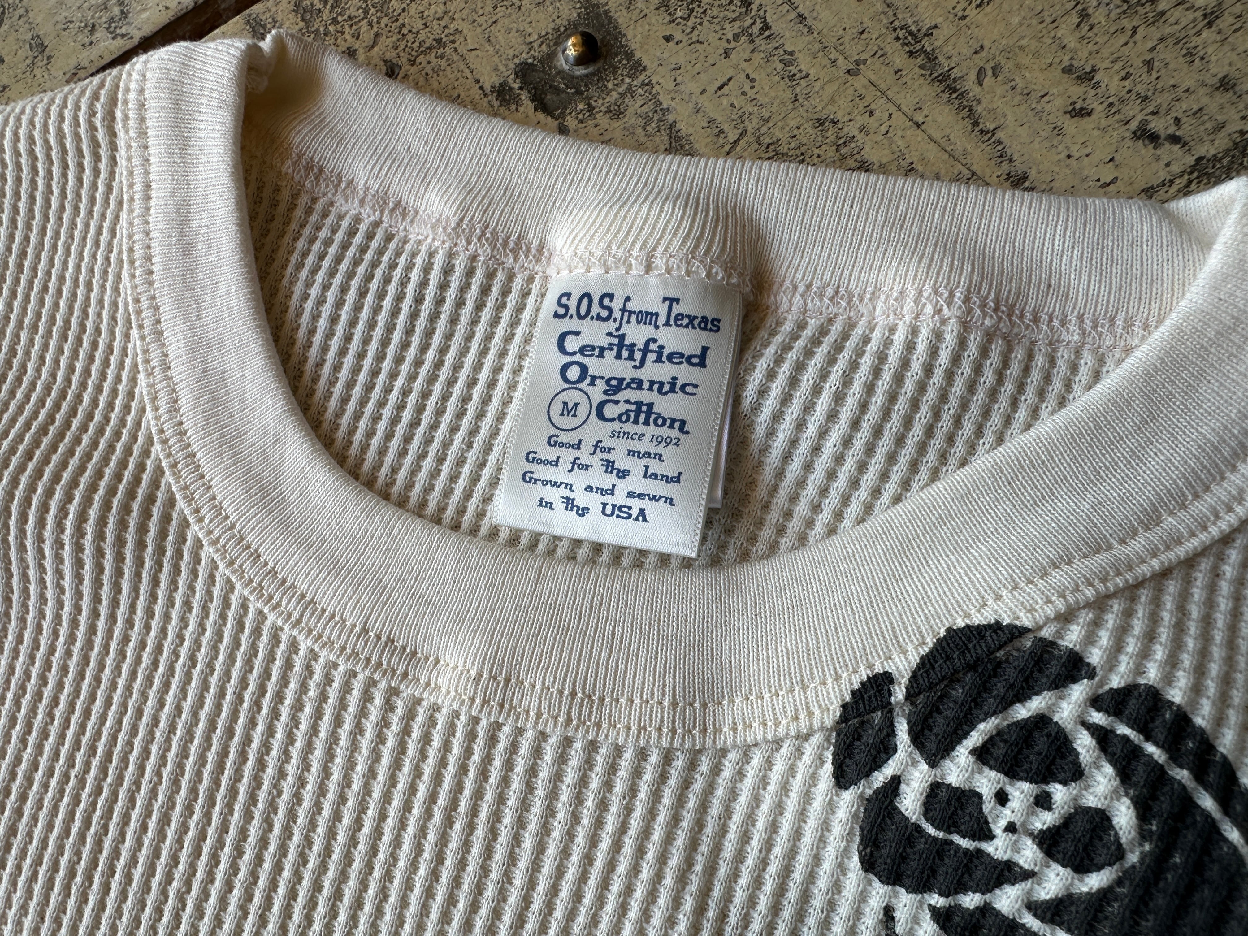 「常にfastの対極に在ること」をテーマとし、「 Organic + The Handworks 」に拘ったペイントTシャツを製作するCONTINUUM(コンテニューム)とのオフィシャル・コラボレーションとなる、総柄ペイント・サーマル・ロングスリーブ・Tシャツ。CONTINUUM 山田氏が自らデザインするモチーフは、この地球の自然界や、古来から大切に受け継がれてきたネイティブアメリカンの智慧、60年代後半のフラワームーブメントなど、脈々と続いてきたカウンターカルチャーからインスピレーションを受け、彼独自のフィルターを通して表現される。ペイント柄の型紙からハンドメイドで制作し、じっくり時間をかけて一点一点丁寧に塗布。S.O.S.のTシャツに浮かび上がるそのモチーフは、ハンドペイントだからこそ生まれる絶妙なムラ感で、洗うたびに生地に馴染じむヴィンテージなエイジングもお楽しみ頂けます。今回、その塗料まで天然染料を用いることに拘り、両ブランドのカルチャーへのリスペクトと想いが詰まったプロダクトが完成した。左袖には、S.O.S. from Texas × CONTINUUMのコラボレーションの証として、『 Morning Star 』のアイコンが記されている。