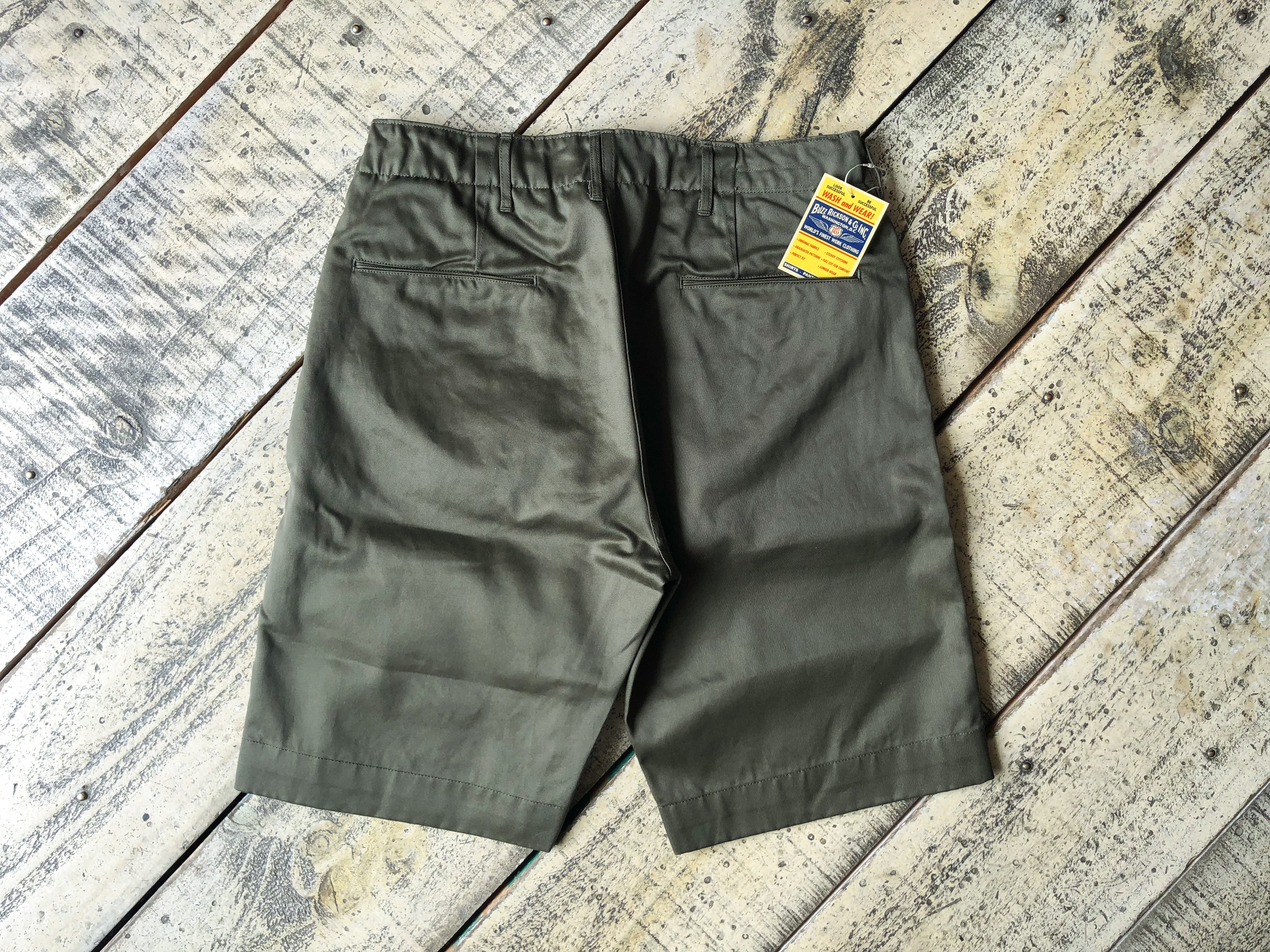 バズリクソンズのオリジナルスペックで作られたミリタリーチノのショートカットモデル。生地はヴィンテージから再現したハリがあり強度の高いコットンチノクロス。ディテールは様々な年代のチノパンを分析し、1940年代の2本針巻き縫い仕様やハンドメイドによる両玉縁ポケット、1960年代のジッパーフライなどを取り入れた。シルエットは当時のモデルより細身に仕上げている。