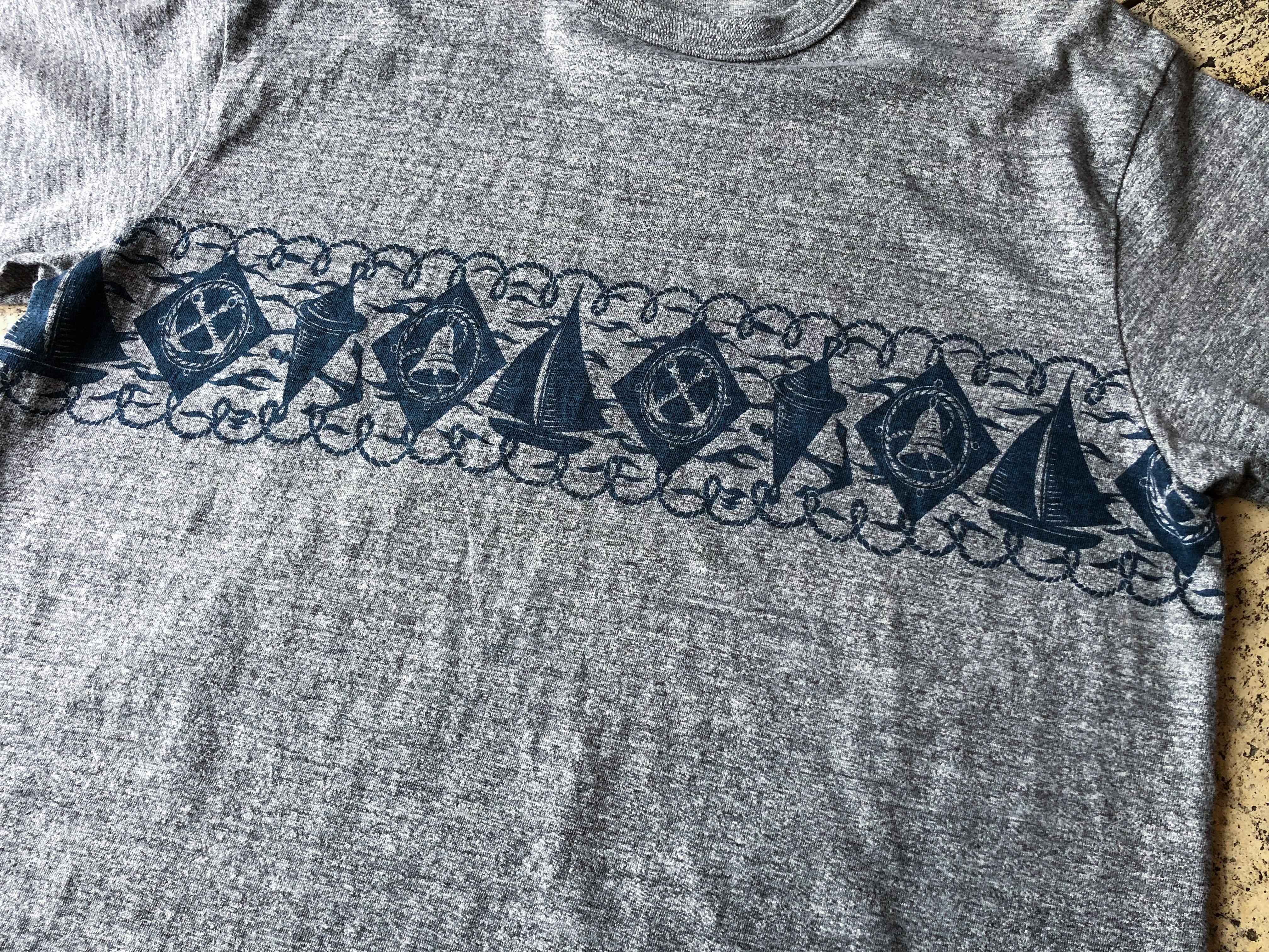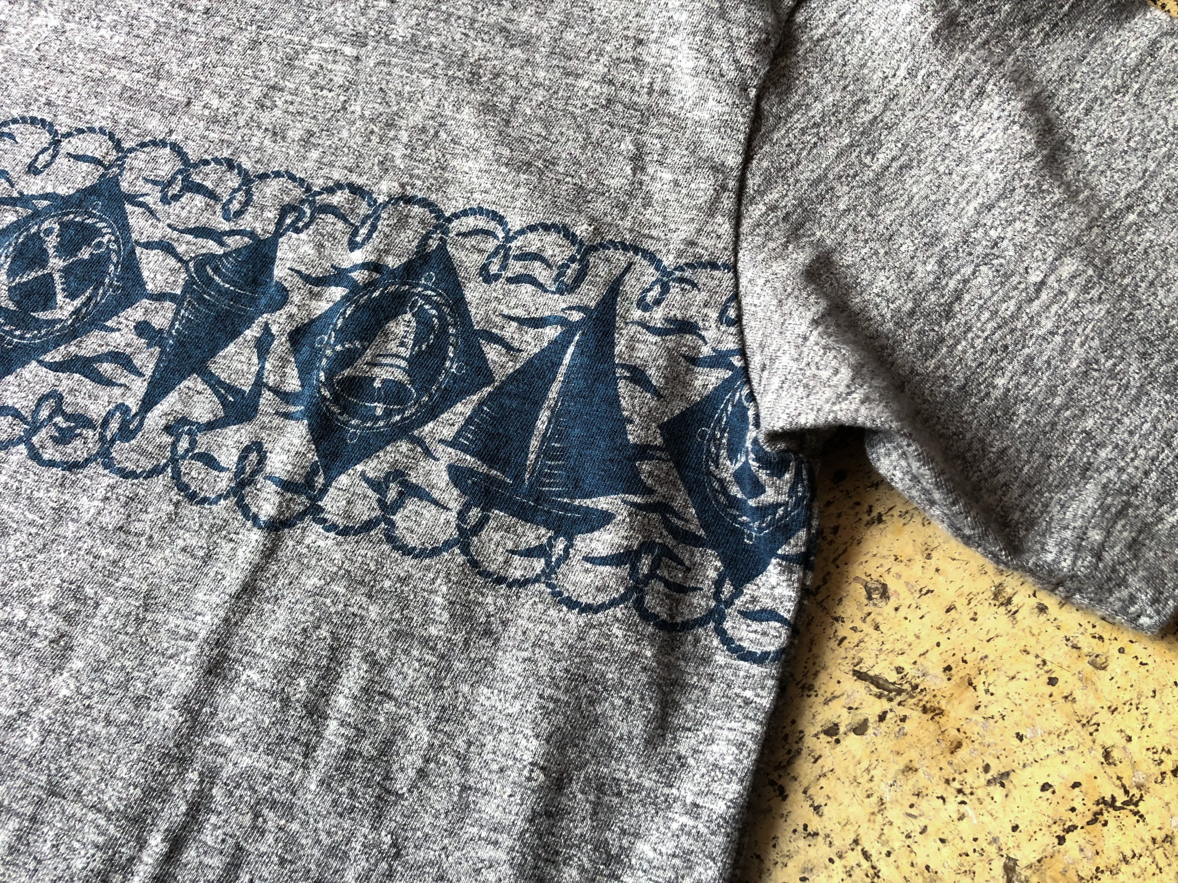 サンサーフらしく、ヨットやアンカーなどマリーンをモチーフに前胸から背中までボーダー柄にした半袖Tシャツです。